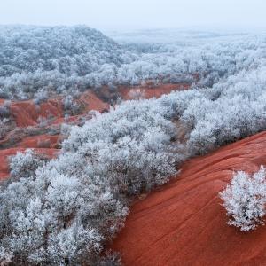 Bükkfa-fürgekarolópók egy vörös zuzmóval borított öreg mandulafa kérge közé simul. A képen a pók különös, lapos testének kékes árnyalatai és a zuzmó színei a lehető legjobb fényben kerültek összhangba.