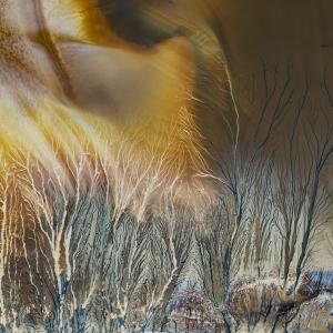 The tailing pond of the Roșia Montană gold mine offers a spectacular and colourful sight around the stream's inflow. From the air, a drone reveals an inexhaustible supply of compositions in this small area: the patterns of the water, mud, and surrounding landscape play with light in vibrant colours, creating a very picturesque result.